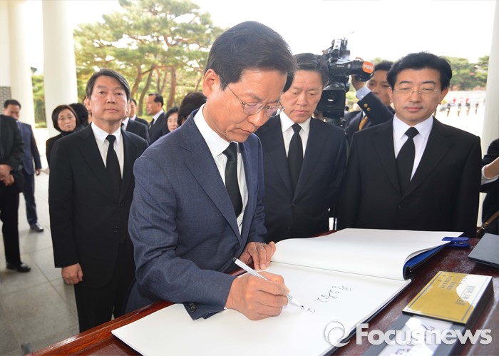 (서울=포커스뉴스) 천정배 국민의당 상임공동대표가 15일 오전 동작구 국립서울현충원에서 현충탑 참배를 마친 뒤 방명록을 작성하고 있다.