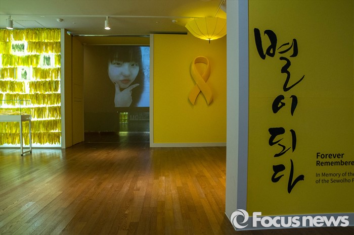 (서울=포커스뉴스) 세월호 2주기를 하루 앞둔 15일 오전 서울 중구 서울도서관에 '별이되다' 추모 전시가 열리고 있다.