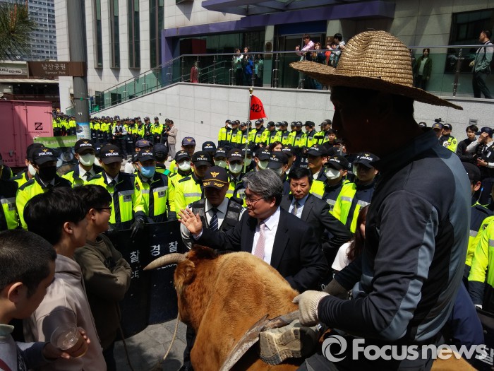서울 중부경찰서는 "동물을 집회현장에 대동하는 것은 집시법 위반"이라고 밝히며 소를 현장으로부터 다른 곳으로 차에 태워 옮길 것을 요구했다.
