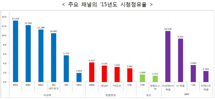 2014년과 2015년을 비교하면 MBC는 0.269%포인트(p) 소폭 상승했으며, KBS2(2.182%p↓), KBS1(1.745%p↓), SBS네트워크(0.810%p↓)는 하락했다.