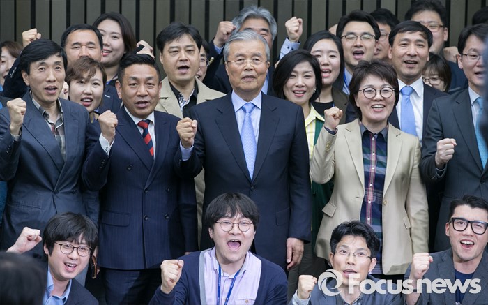 | △ 당직자들과 파이팅 외치는 김종인 |