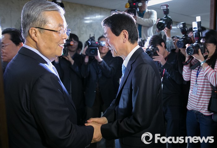 (서울=포커스뉴스) 김종인(왼쪽) 더불어민주당 비대위 대표 겸 선대위원장이 15일 오후 서울 여의도 국회에서 20대 총선 중앙선대위 해단식을 마친 뒤 진영 부위원장과 악수하고 있다.