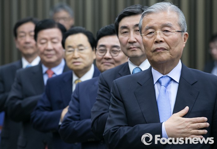 (서울=포커스뉴스) 김종인 더불어민주당 비대위 대표 겸 선대위원장과 선대위원들이 15일 오후 서울 여의도 국회에서 열린 20대 총선 중앙선대위 해단식에 참석해 국기에 대한 경례를 하고 있다. 오른쪽부터 김 대표, 이종걸 원내대표, 전병헌, 송현섭, 이근식, 진영 부위원장.