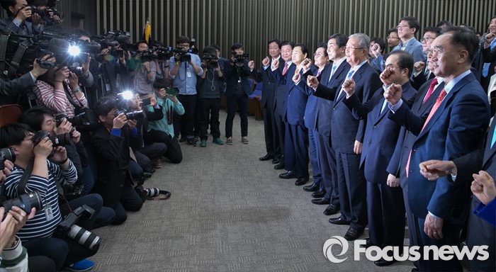 (서울=포커스뉴스) 김종인 더불어민주당 비대위 대표 겸 선대위원장과 선대위원들이 15일 오후 서울 여의도 국회에서 열린 20대 총선 중앙선대위 해단식에 참석해 구호를 외치고 있다.