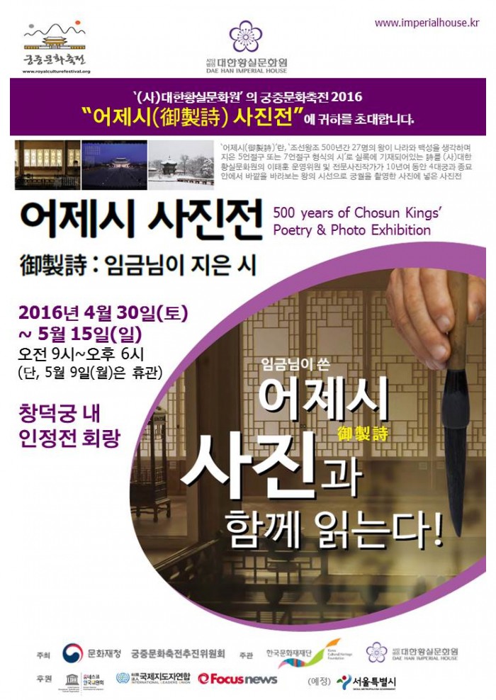 (서울=포커스뉴스) 대한황실문화원은 '제2회 궁중문화축전 2016' 중에서 문화원이 독자적으로 진행하는 '어제시(御製詩) 사진전'과 '왕실내의원 체험' 운영을 함께할 운영요원과 자원봉사자 등을 모집한다고 15일 밝혔다.