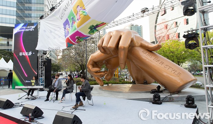 (서울=포커스뉴스) 15일 오후 서울 강남구 삼성동 코엑스 동측 광장 앞에서 강남스타일 랜드마크 조형물 준공 기념 제막식에 앞서 식전행사가 열리고 있다.