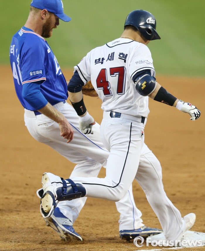 (서울=포커스뉴스) 15일 서울 잠실구장에서 열린 2016 프로야구 삼성-두산 경기 1회말 2사 1,2루에서 삼성 투수 벨레스터가 1루 베이스 커버를 들어와 두산 박세혁을 아웃시키고 있다.