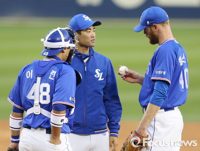 (서울=포커스뉴스) 15일 서울 잠실구장에서 열린 2016 프로야구 삼성-두산 경기에서 1회말 삼성 포수 이흥련이 마운드에 올라가 투수 벨레스터를 안정시키고 있다.