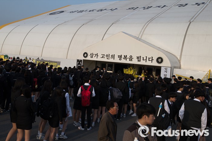(안산=포커스뉴스) 세월호 참사 2주기를 하루 앞둔 15일 오후 경기도 안산시 단원구 세월호 정부합동분향소에서 안산시 고교학생회장단연합회 학생들이 추모제 행진을 위해 준비를 하고 있다.