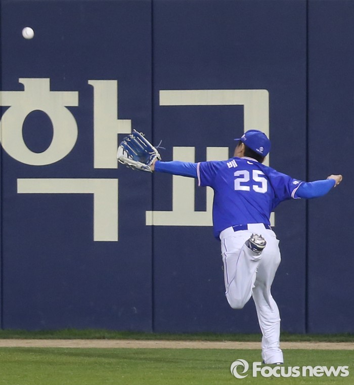 (서울=포커스뉴스) 15일 서울 잠실구장에서 열린 2016 프로야구 삼성-두산 경기 8회말 2사 1루에서 삼성 우익수 배영섭이 두산 최주환의 타구를 잡으려고 쫓아 가고 있다