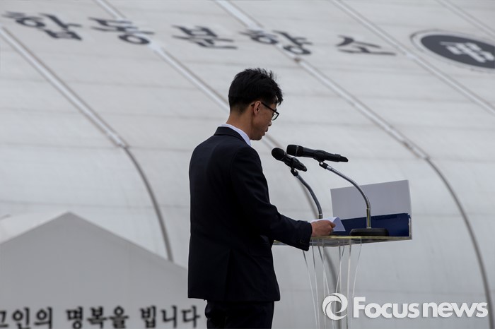 (안산=포커스뉴스) 16일 오전 경기도 안산시 단원구 화랑유원지에 마련된 합동분향소에서 열린 '세월호 참사 2년 기억식'에서 한 유가족이 경과 보고를 하고 있다.