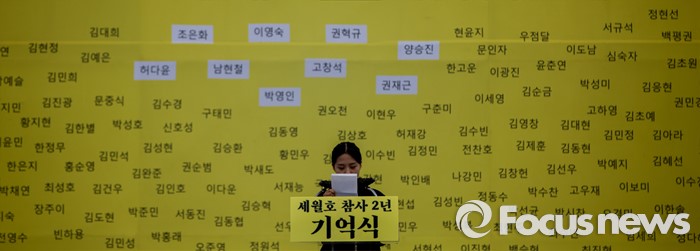 (안산=포커스뉴스) 16일 오전 경기도 안산시 단원구 화랑유원지에 마련된 합동분향소에서 열린 '세월호 참사 2년 기억식'에 참석한 한 유가족이 편지를 낭동 하고 있다.