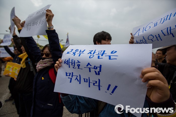 (안산=포커스뉴스) 세월호 참사 2주기인 16일 오전 경기도 안산시 단원구 화랑유원지에 마련된 합동분향소 앞에서 전국교직원노동조합 관계자들이 이준식 사회부총리 겸 교육부 장관에게 '4.16 교과서 활용 계기수업' 진행 승인 촉구 하고 있다.