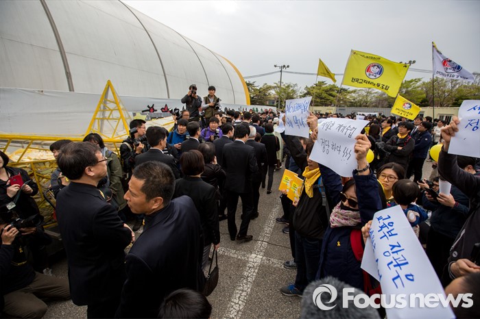 (안산=포커스뉴스) 세월호 참사 2주기인 16일 오전 경기도 안산시 단원구 화랑유원지에 마련된 합동분향소 앞에서 전국교직원노동조합 관계자들이 이준식 사회부총리 겸 교육부 장관에게 '4.16 교과서 활용 계기수업' 진행 승인 촉구 하고 있다.
