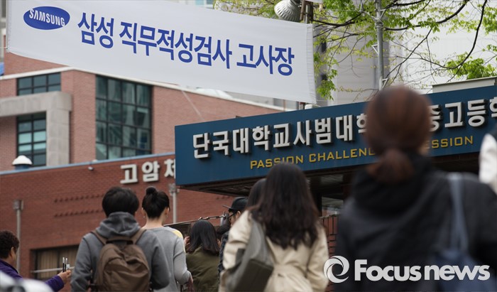 한편 삼성그룹은 인·적성검사 GSAT 합격자를 대상으로 직무역량 면접, 창의성 면접, 임원 면접을 거쳐 최종 합격자를 선발한다. 삼성의 이번 채용 규모는 지난해 하반기와 비슷한 4000~4500명 수준인 것으로 알려졌다.(서울=포커스뉴스) 17일 오전 서울 강남구 단국대학교부속고등학교에서 삼성그룹 공개채용시험 직무적성검사(GSAT)를 치르기 위한 취업준비생들이 고사장으로 향하고 있다. 2016.04.17 오장환 기자
