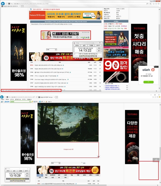 문체부는 앞으로도 불법 사이트를 추가로 선정해 사이트가 폐쇄될 때 까지 집중적인 광고 차단을 실시할 예정이다. 또한 도박, 음란물, 불법 의약품과 같은 광고주의 협조를 기대하기 어려운 불법광고에 대해서는 경찰청, 식약처 등 해당 기관에 신고해 불법 광고와 연결된 사이트를 차단함으로써 광고가 제 기능을 하지 못하도록 할 방침이다.광고 게시중단 요청 전 광고 현황(위)과 광고 게시중단 요청 후 광고 현황. 일반광고는 차단된 상태이며 불법광고만 존재하고 있다.<사진제공=문화체육관광부>