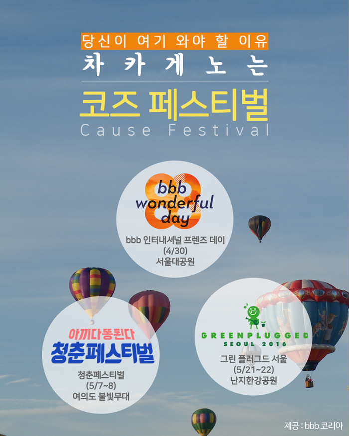 놀고 즐기면서 사회적 가치까지 전달할 수 있는 '코즈 페스티벌(Cause Festival)'이 축제의 새로운 트렌드로 자리 잡으면서 '착한 소비'를 하고자 하는 이들의 눈길을 끌고 있다. 전국 방방곳곳 축제의 물결이 수놓이는 올 봄, 유쾌한 재미와 함께 건강한 정신까지 꽃 피워줄 '코즈 페스티벌'에 참여해보는 것은 어떨까.