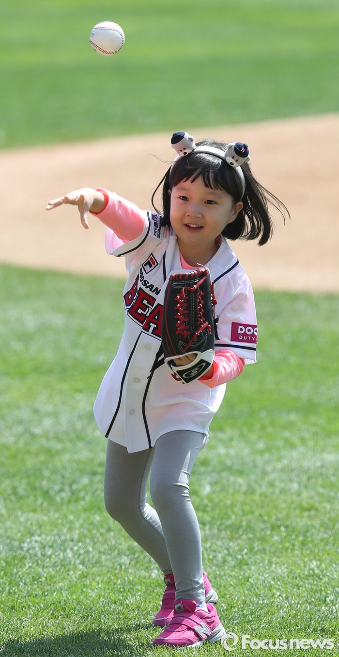 (서울=포커스뉴스) 17일 서울 잠실구장에서 열린 2016 프로야구 삼성-두산 경기에 앞서 TV 드라마 '응답하라 1988'에 진주로 출연했던 아역탤런트 김설 어린이가 시구하고 있다.