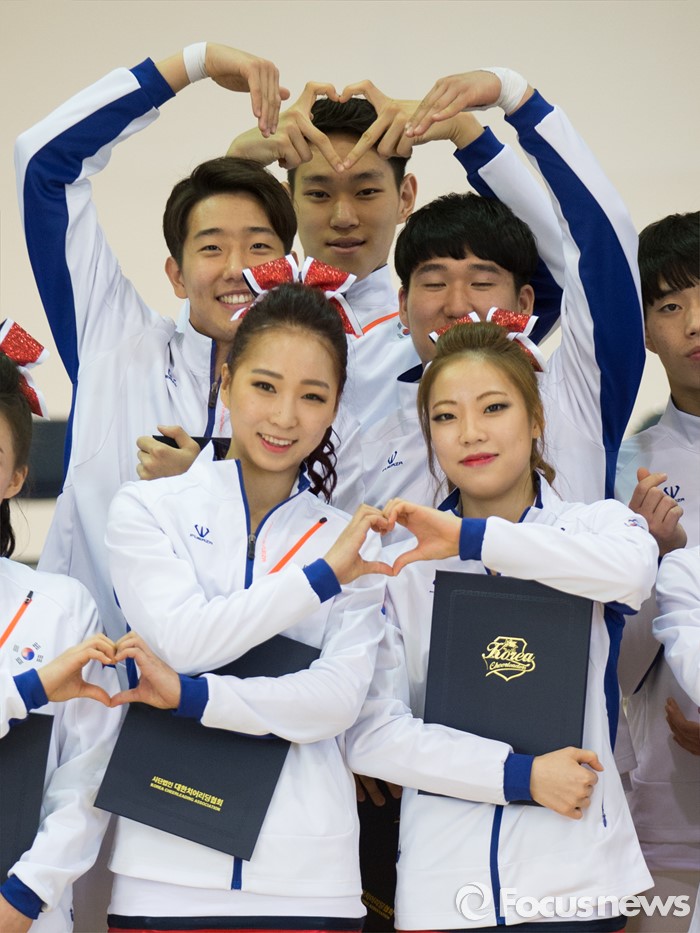 (서울=포커스뉴스) 17일 오후 서울 서대문구 동명여자중학교 체육관에서 열린 '2016 치어리딩 국가대표 선수단 출정식'에 참석한 선수들과 임원들이 기념촬영 하고 있다.