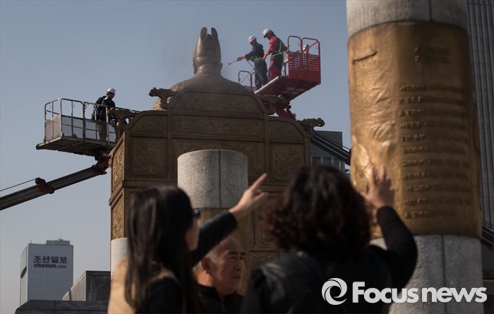 (서울=포커스뉴스) 18일 오전 서울 세종로사거리 광화문광장에서 서울시 관계자들이 세종대왕 동상 세척작업을 하고 있다.