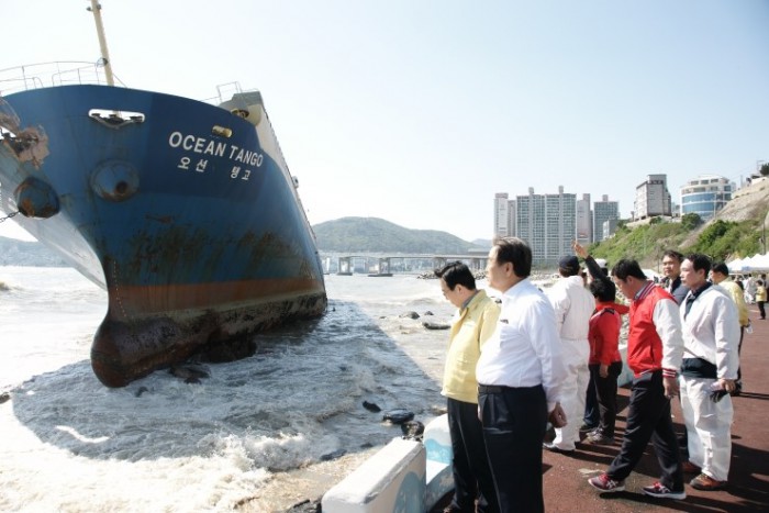 김 전 대표는 이날 오후 자신의 지역구인 부산 영도 바닷가를 찾아 강풍 피해로 좌초된 화물선을 살펴보고 기름 방제작업 모습을 지켜봤다.
