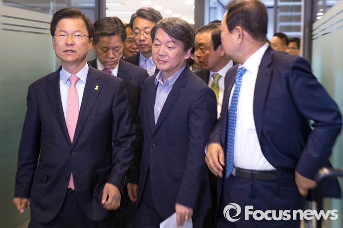 (서울=포커스뉴스) 안철수(왼쪽 두번째)-천정배(왼쪽 첫번째) 국민의당 대표가 18일 오전 서울 마포구 국민의당 당사에서 열린 최고위원회의에 참석하고 있다.