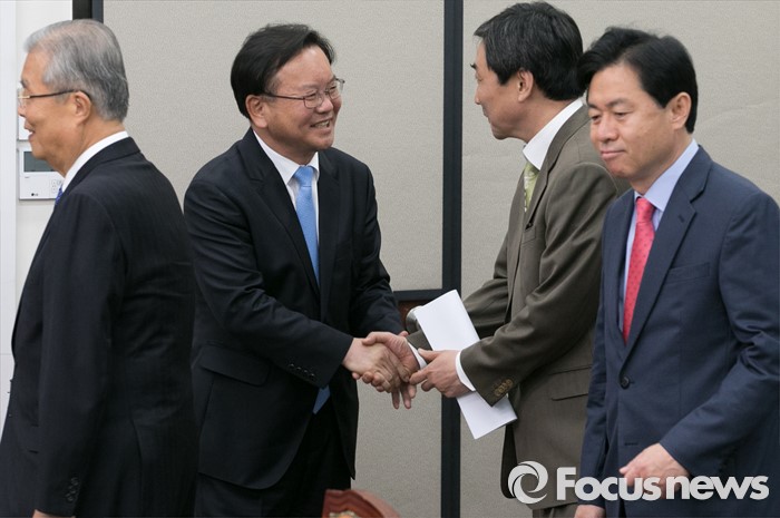 (서울=포커스뉴스) 이종걸 더불어민주당 원내대표가 18일 오전 서울 여의도 국회에서 비상대책위원회의에 앞서 당선 인사를 위해 방문한 김부겸 대구 수성갑 당선인과 악수하고 있다. 왼쪽부터 김종인 비대위 대표, 김 당선인, 이 원내대표, 김영춘 비대위원.