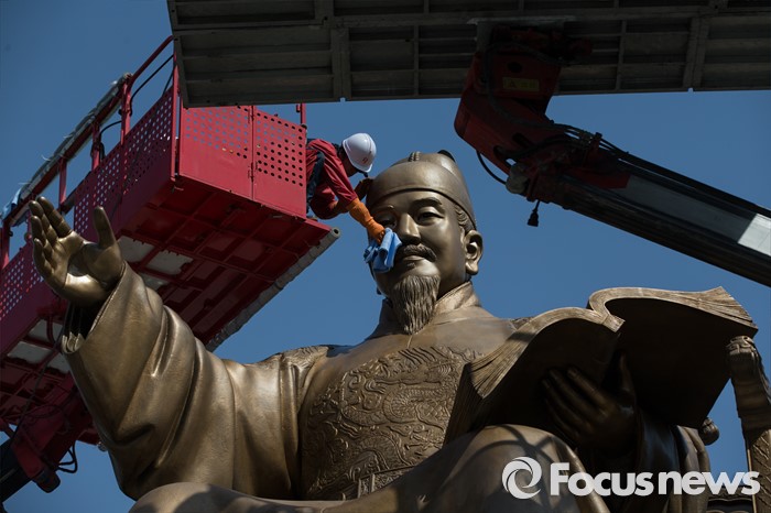 (서울=포커스뉴스) 18일 오전 서울 세종로사거리 광화문광장에서 서울시 관계자들이 세종대왕 동상 세척 및 보존 작업을 하고 있다.