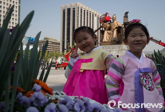 | △ 한복 입은 아이들과 묵은 때 벗기는 세종대왕 |