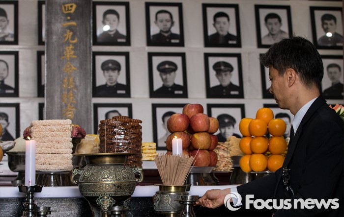 (서울=포커스뉴스) 4·19 혁명 56주기를 하루 앞둔 18일 오전 서울 강북구 국립4.19 민주묘지 유영봉안소에서 열린 4.19 혁명 희생영령 추모제를 찾은 유가족 및 관계자들이 예를 올리고 있다.