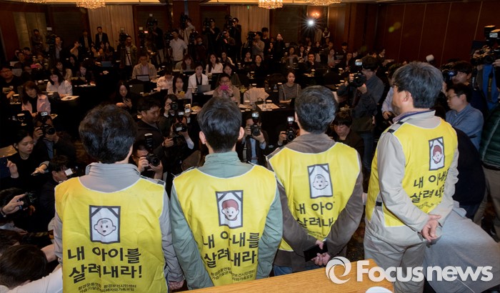 (서울=포커스뉴스) 18일 오전 서울 중구 롯데호텔앤리조크 서울에서 열린 가습기 살균제 사망사건 관련 기자회견이 끝나고 피해자 유족들을 비롯한 시민단체 회원들이 입장을 발표하고 있다.