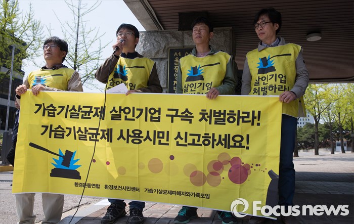 (서울=포커스뉴스) 18일 오전 서울 서초구 서울중앙지방검찰청 앞에서 가습기살균제피해자와가족모임 등 단체들이 엄정한 가습기 살균제 피해 조사를 촉구하는 기자회견을 하고 있다.