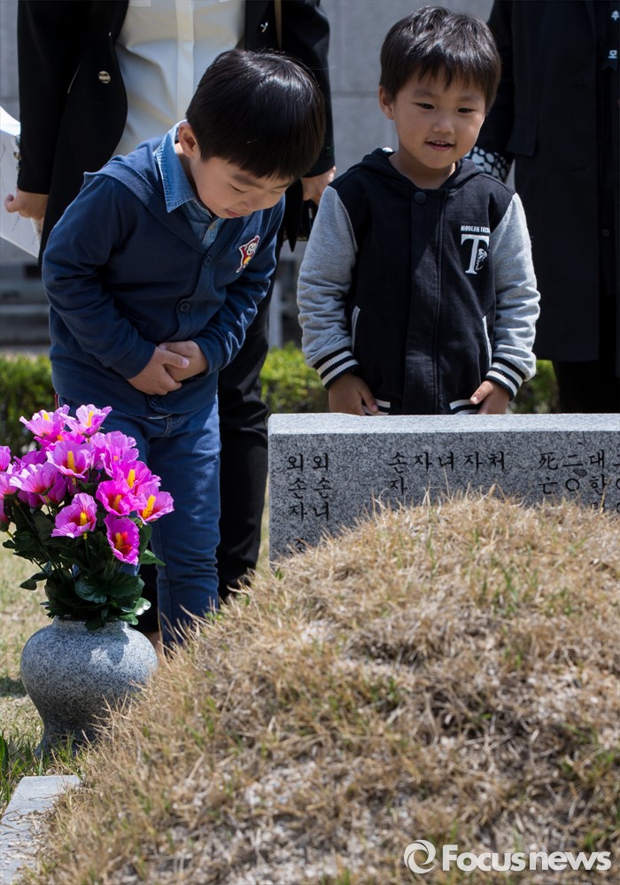 (서울=포커스뉴스) 4·19 혁명 56주기를 하루 앞둔 18일 오전 서울 강북구 국립4.19 민주묘지에서 희생자의 손자들이 묘비에 인사하고 있다.