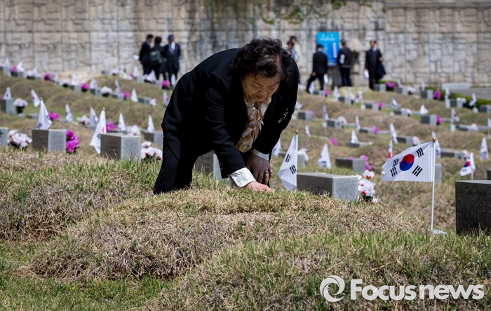 (서울=포커스뉴스) 4·19 혁명 56주기를 하루 앞둔 18일 오전 서울 강북구 국립4.19 민주묘지에서 희생자의 유가족이 묘의 잡초를 뽑고 있다.