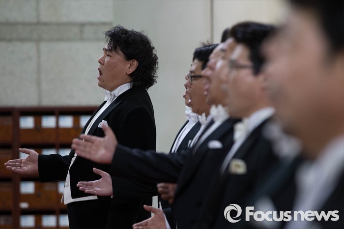 (서울=포커스뉴스) 18일 오전 서울 서초구 중앙지방법원에서 보헤미안 싱어즈가 '시민과 함께하는 음악회'에 참석해 공연을 하고 있다.