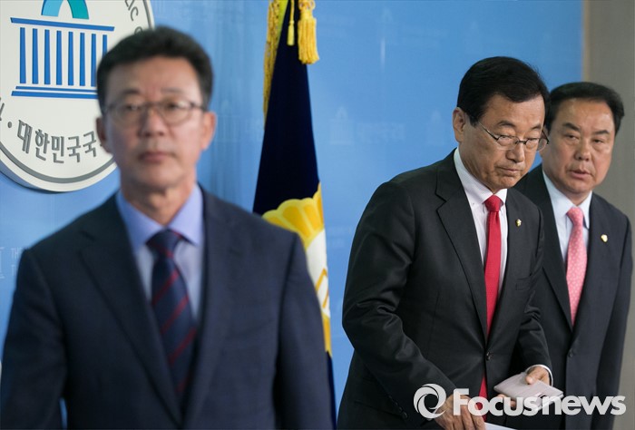 | △ 기자회견장 나서는 홍철호-이현쟁-이우현 |