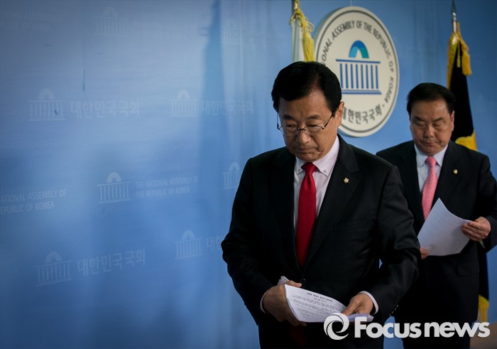 (서울=포커스뉴스) 20대 총선 수도권 지역에서 당선한 이현재(경기 하남, 왼쪽),이우현(경기 용인갑) 의원이 18일 오후 서울 여의도 국회 정론관에서 정쟁을 중단하고 민생경제를 살리자는 내용의 성명서를 발표한 뒤 퇴장하고 있다.