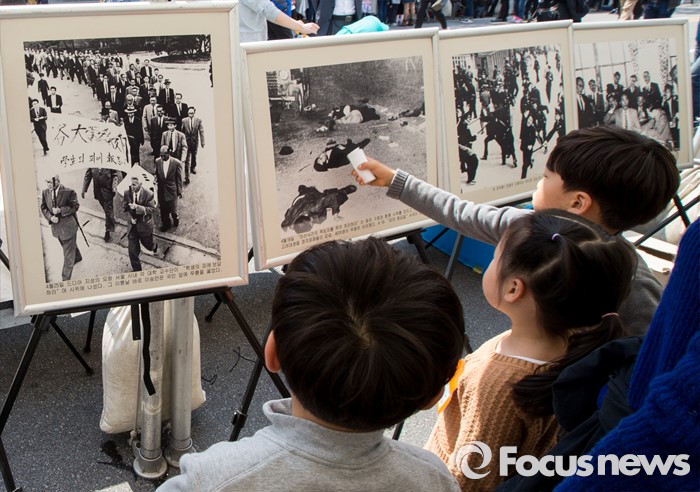 (서울=포커스뉴스) 4·19 혁명 56주기를 하루 앞둔 18일 오후 서울 강북구 광산사거리 인근에서 열린 '4.19 혁명 국민문화제 2016'에 참석한 어린이들이 혁명 당시 사진 자료들을 보고 있다.