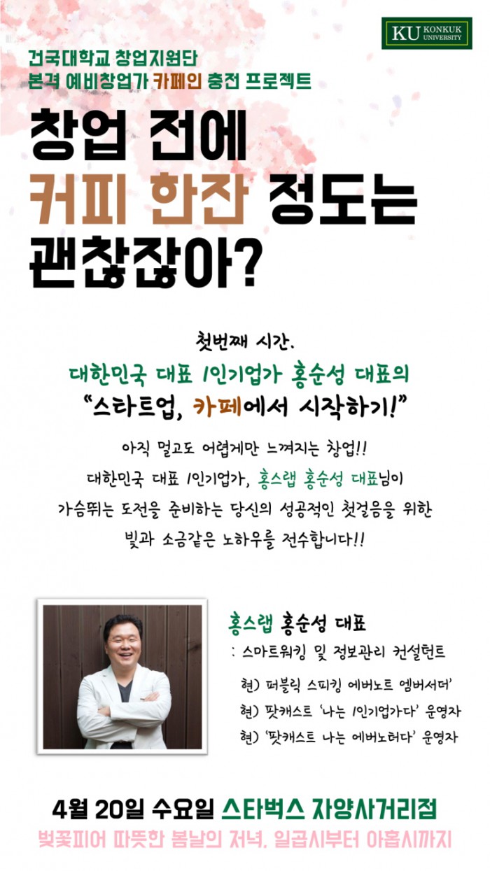 참가신청은 건국대 창업지원단을 통해 가능하다.참여형 창업지원 프로그램 '창업 전에 커피 한잔 정도는 괜찮잖아?'. <사진제공=건국대학교>