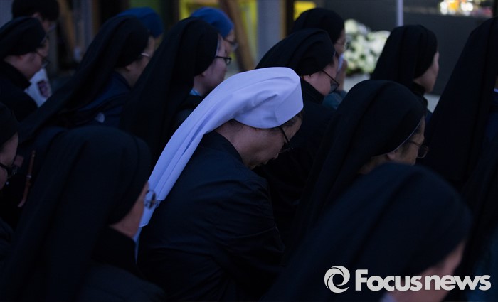 (서울=포커스튜스) 세월호 참사 2주기가 이틀 지난 18일 오후 서울 종로구 광화문광장에서 신부들이 '세월호 희생자 기억미사'에 참석해 기도하고 있다.