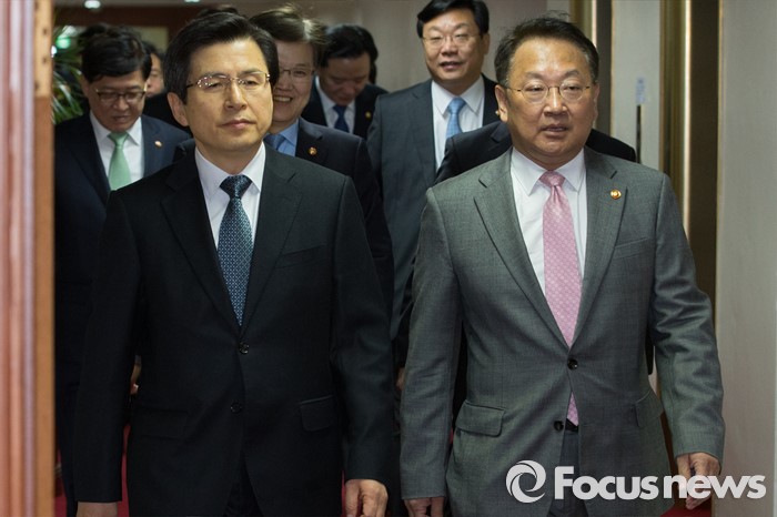 (서울=포커스뉴스) 황교안 국무총리가 19일 오전 서울 종로구 정부서울청사에서 열린 국무회의에 유일호 경제부총리 겸 기획재정부 장관을 비롯한 국무위원들과 함께 참석하고 있다.