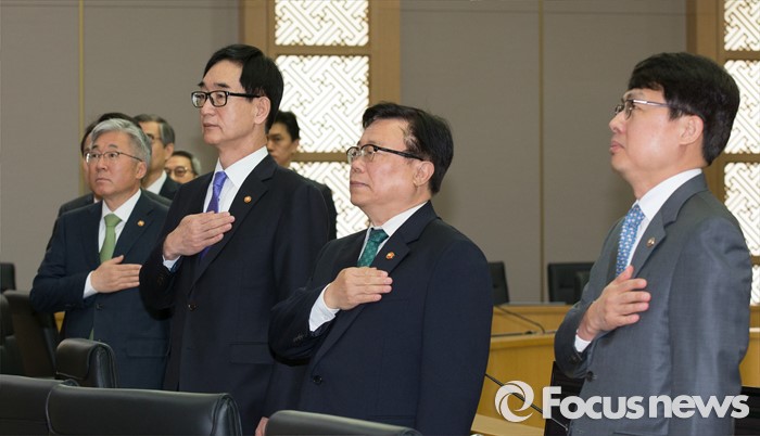 (세종=포커스뉴스) 19일 오전 세종시 정부세종청사 국무회의장에서 서울-세종 영상회의로 열린 국무회의에 참석한 국무위원들이 국기에 대한 경례를 하고 있다.