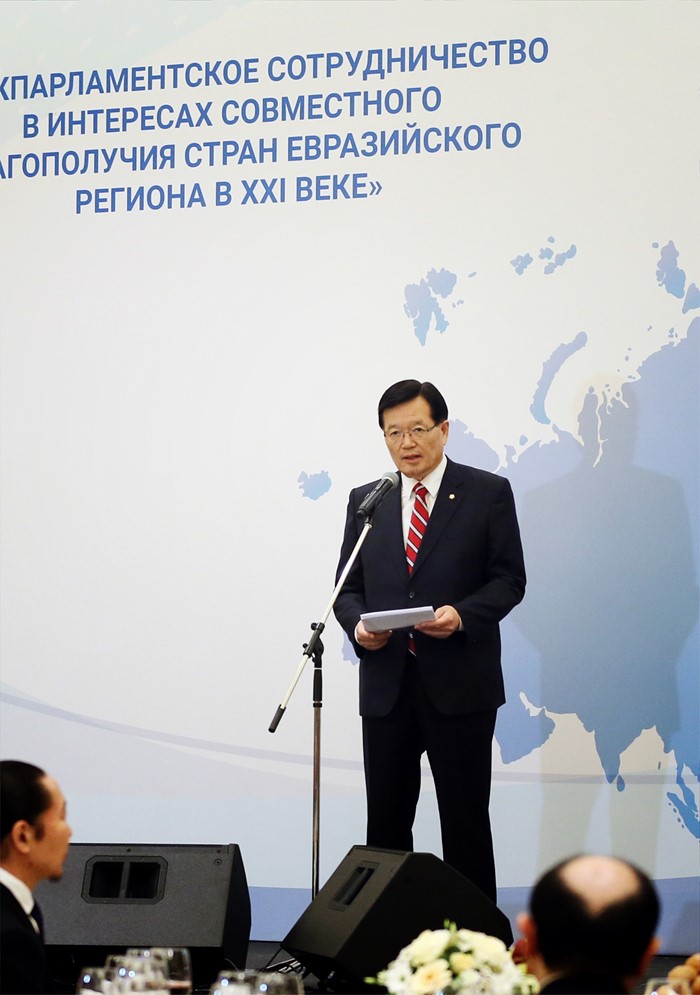 (서울=포커스뉴스) 정의화 국회의장이 18일 오후(현지시각) 모스크바 롯데호텔에서 유라시아 각국 의회지도자들을 초청해 열린 한·러 공동 주최 만찬에 참석해 환영사를 하고 있다. <사진제공=국회>