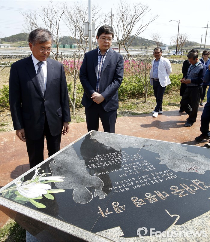 (서울=포커스뉴스) 문재인(왼쪽) 전 더불어민주당대표가 18일 김대중 전 대통령의 3남인 김홍걸 더불어민주당 국민통합위원장과 함께 전남 신안 하의도에 있는 김 전 대통령의 생가를 방문, DJ기념비를 보고 있다.<사진제공=문재인의원실>