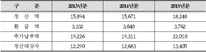 2015년도분 정산액은 2014년도분(1조5671억원)보다 증가했는데, 이는 각 사업장에서 보수 변경을 신고한 결과 보수가 증가한 근로자 수가 예년에 비해 늘어난 것이 주요한 요인으로 분석된다.