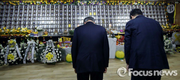 (서울=포커스뉴스) 문재인(왼쪽) 더불어민주당 전 대표와 故 김대중 전 대통령의 3남 김홍걸 국민통합위원장이 지난 18일 전남 진도 팽목항에 마련된 세월호 참사 희생자 분향소를 찾아 조문하고 있다. <사진제공=문재인 의원실>