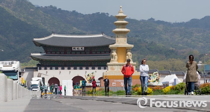 (서울=포커스뉴스) 19일 오전 서울 광화문광장에 봉축장엄등이 설치돼 있다. 20일 광화문광장에서 열리는 봉축장엄등 점등식은 국보 제35호인 화엄사 사사자삼층석탑을 원형으로 삼아 제작됐다.