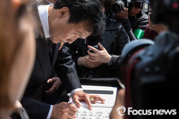 (서울=포커스뉴스) 19일 오전 손학규 전 더불어민주당 상임고문이 서울 강북구 국립 4.19민주묘지를 찾아 참배한 뒤 방명록을 쓰고 있다.