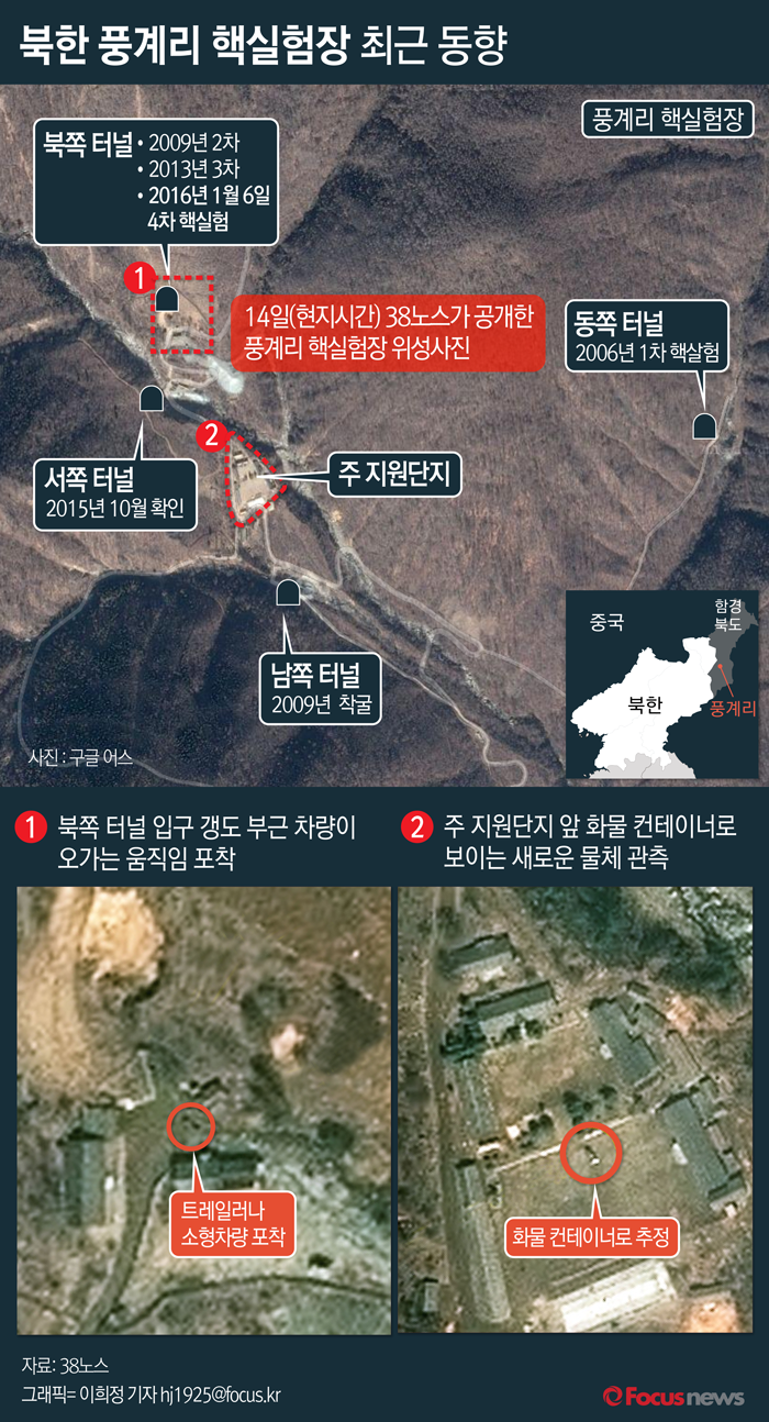 (서울=포커스뉴스) 38노스에 따르면 지난 14일 북한 함경북도 풍계리 핵실험장의 북쪽 터널 갱도입구 부근을 촬영한 위성사진에 차량용 트레일러 또는 소형 차량으로 추정되는 소형 물체가 포착됐으며 주 지원 단지에서는 선적 컨테이너나 장비 트레일러로 추정되는 물체가 포착됐다.