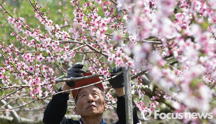 (세종=포커스뉴스) 화창한 봄 날씨를 보인 19일 오전 세종시 연서면 복숭아밭에서 농민이 복사꽃을 속아내고 있다.